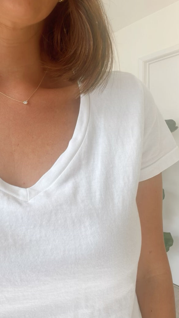 Classic V-neck. The perfect classic fit for every occasion, lightweight but also heavy enough to ensure it isn't see-through. Made with 100% supima cotton. Fabric is dyed, to give a soft touch for a luxe lived-in feel. Clean finished sleeve and the perfect length bottom hem.